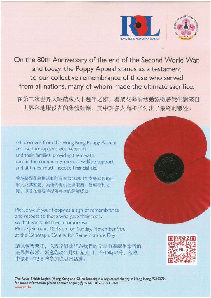 The Royal British Legion (RBL), Hong Kong & China Branch is a registered Hong Kong charity. The RBL is dedicated to providing support to all of Hong Kong’s Ex Service men and women as well as their families, with welfare, financial, social, emotional care, and comradeship. The RBL is best known for the annual Poppy Appeal, its emblem of the red poppy and the annual Remembrance Sunday ceremony, which this year will be on 9th November. All beneficiaries of the donations received and of the ongoing welfare programmes, served in Hong Kong and are residents of Hong Kong.